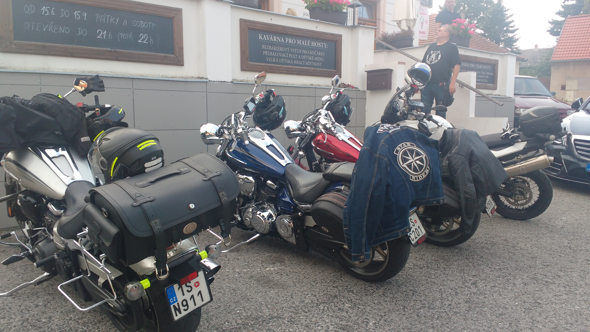 Motorku si můžete zaparkovat přímo před kavárnou a posadit se na zahrádce s výhledem na náměstí i zaparkovené stroje.