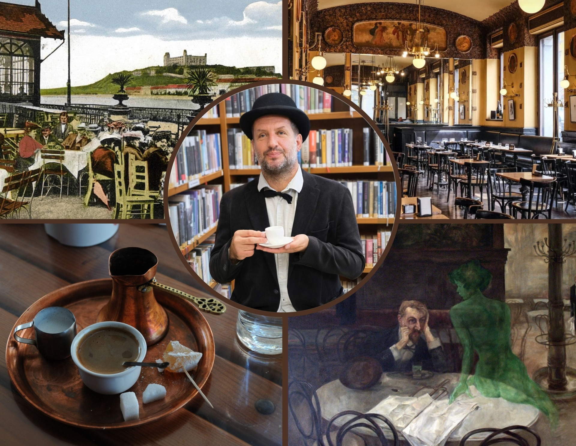 Nespěchá. Tu a tam se posadí do kavárny, povaluje se, pozoruje, jak spěchají jiní. Nahlédneme s ním do slavných kaváren Prahy, Vídně, Krakova, Bratislavy, Budapešti, Lublaně, Terstu nebo Sarajeva.