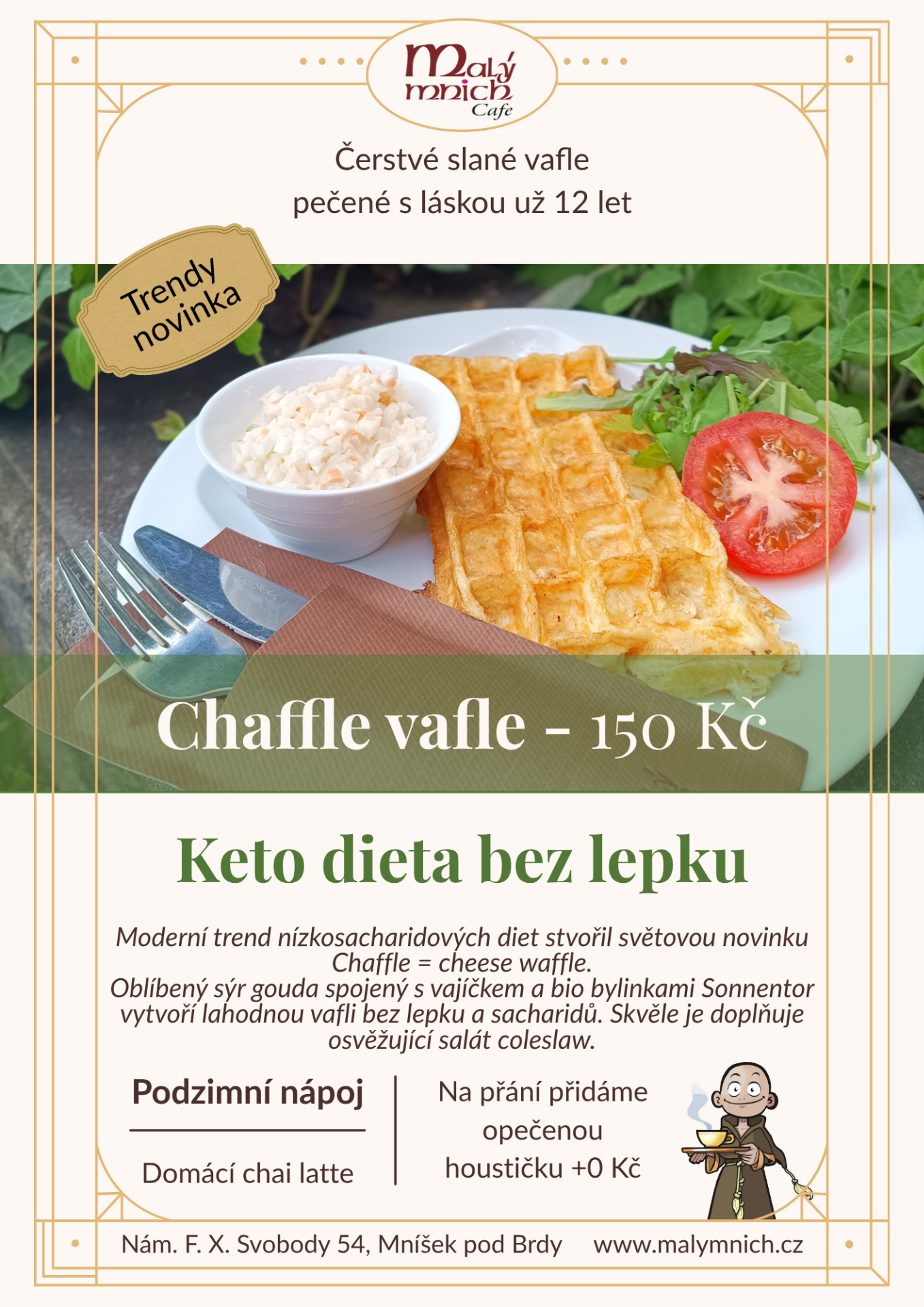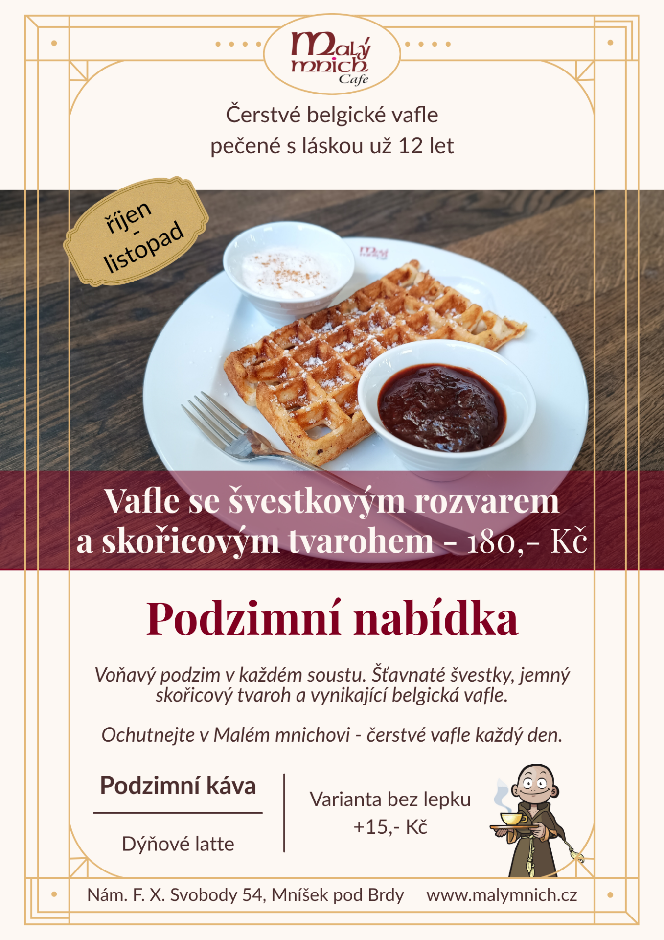 Voňavý podzim najdete v každém soustu. Naši oblíbenou sladkou belgickou vafli jsme doplnili o lahodný švestkový rozvar a krémový skořicový tvaroh.